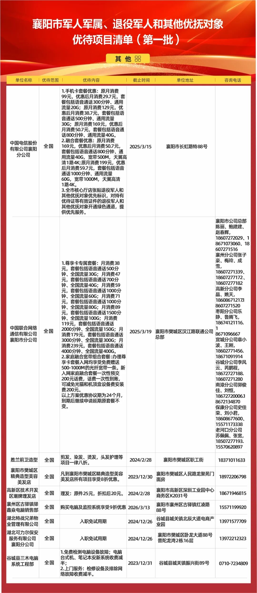 2023襄阳军人军属、退役军人和其他优抚对象优待项目清单