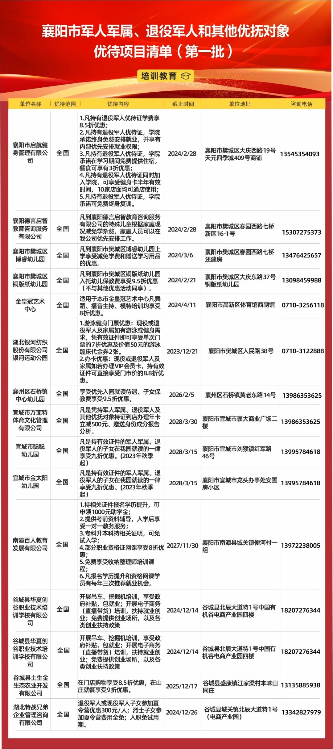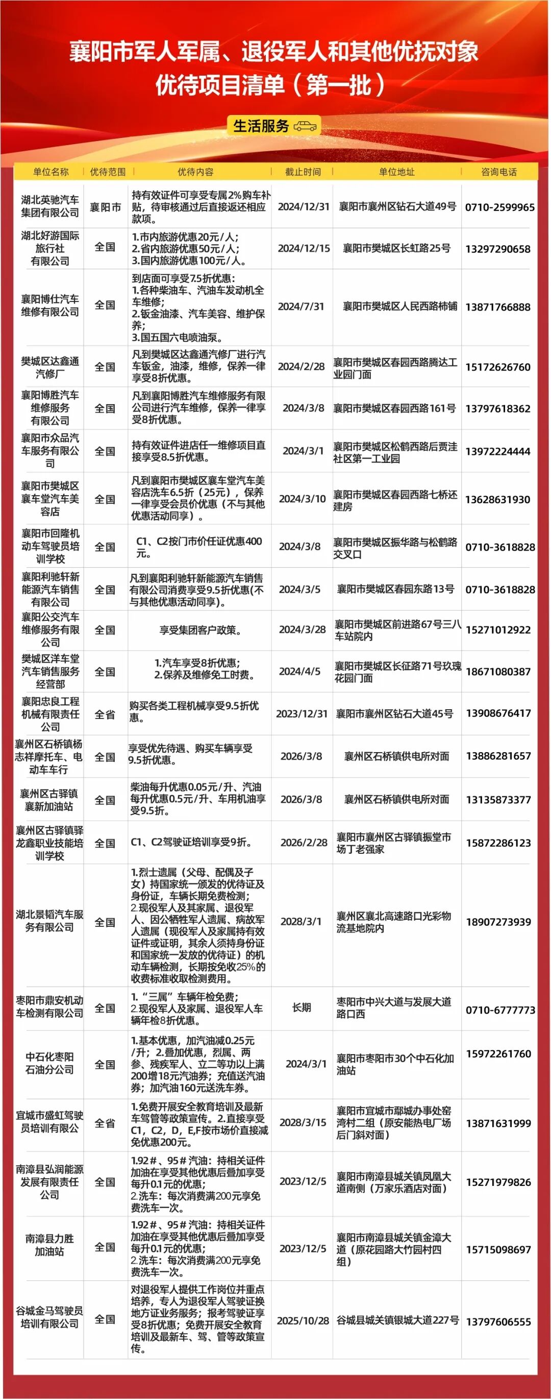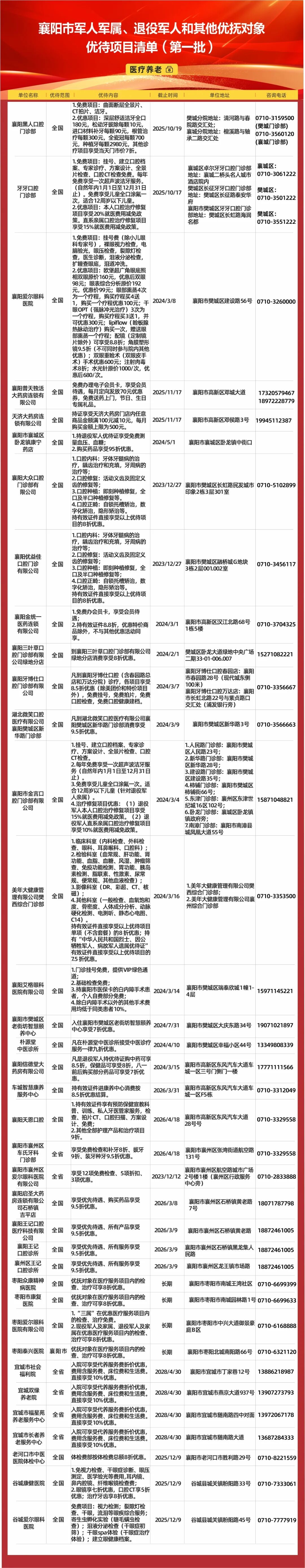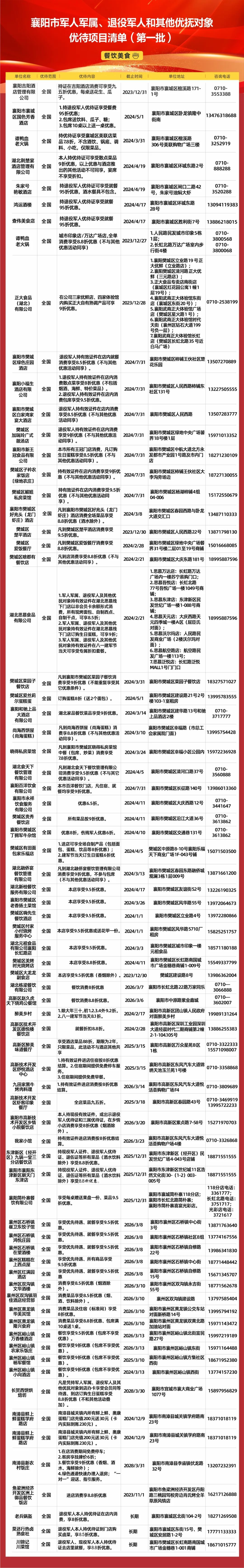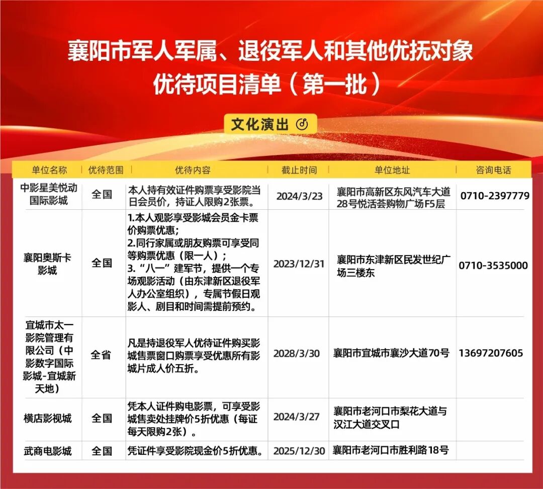 襄阳市公布军人军属、退役军人和其他优抚对象优待项目清单(第一批),全市12个县(市、区)、开发区共签约了311个优待项目,推出各种打折、优惠活动,涉及餐饮、住宿、购物、文化、旅游、医疗、交通、教育等9大类,持优待证、军官证、士兵证等有效证件即可享受优惠优待。